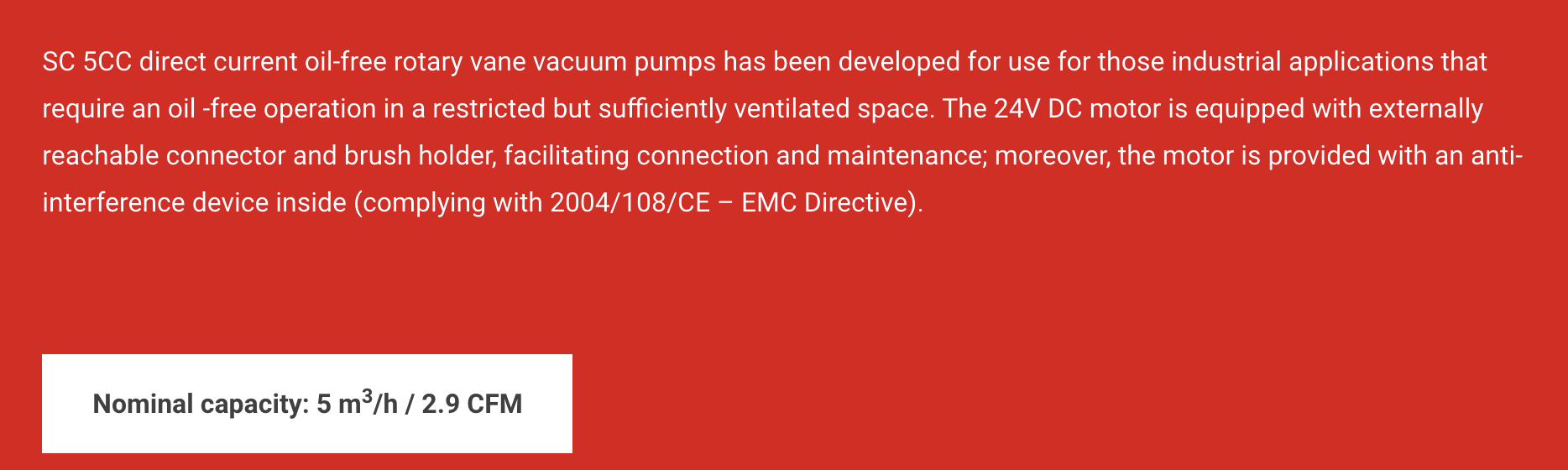The SC 5CC pump includes the FKM gasket positioned to assure a hermetic seal and a long operating time. The SC 5CC pump can also operate as a compressor.